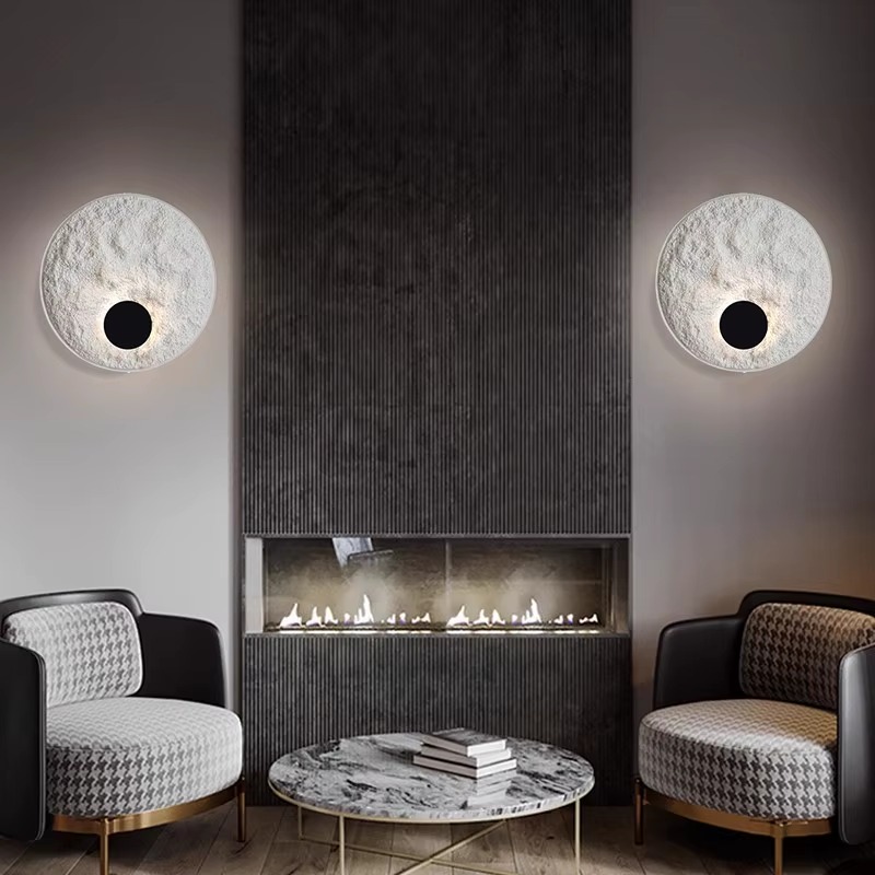 Echipată cu un sistem LED integrat, sursa de lumină este subtil ascunsă în spatele elementului negru central. Această amplasare ingenioasă proiectează un halou cald în jurul texturii albe, evidențiind fiecare detaliu neregulat și creând un spectacol dinamic de umbre și lumini pe perete.