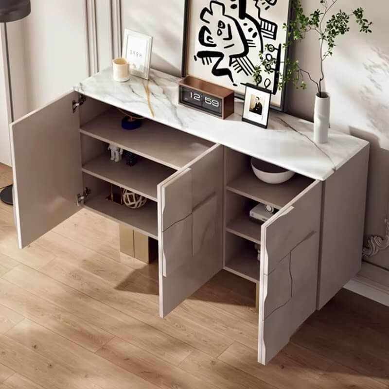 Accentele aurii de la baza picioarelor adaugă o notă sofisticată, în timp ce detaliile sculptate pe fațadele sertarelor oferă un joc elegant de lumini și umbre. Perfectă pentru a depozita vesela, obiecte decorative sau electronice, comoda se potrivește de minune într-un decor contemporan sau minimalist.