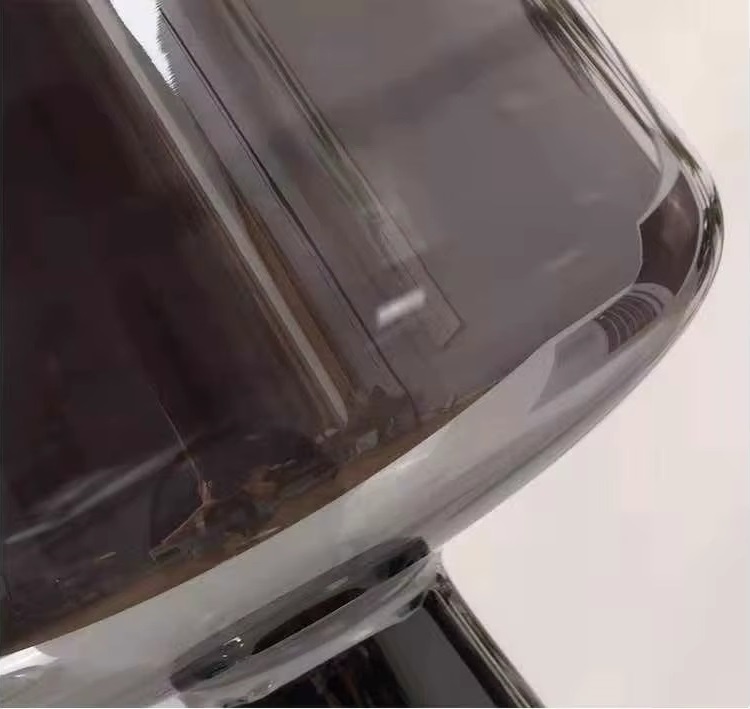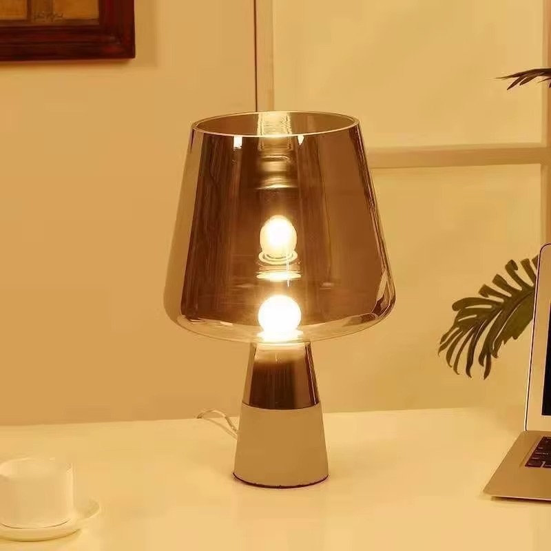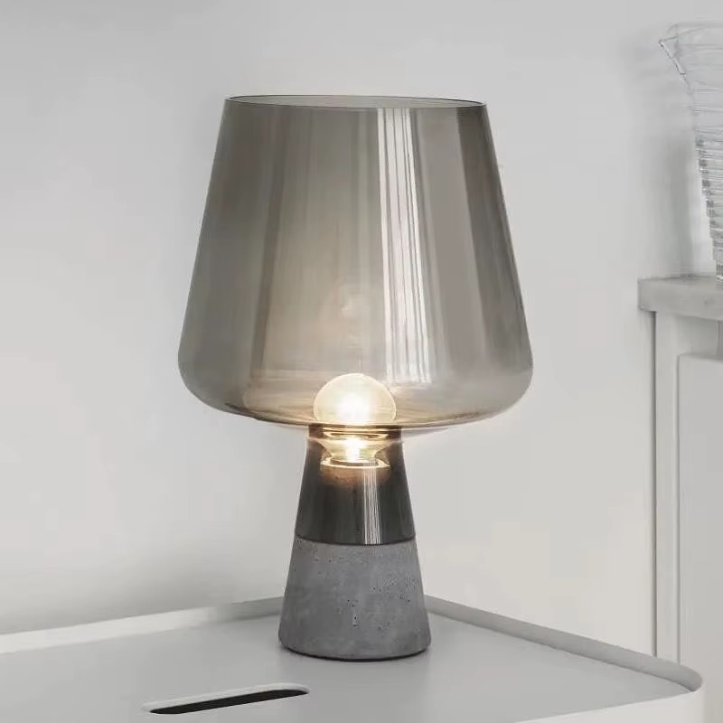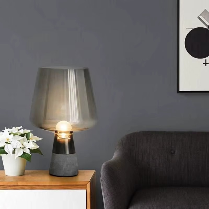 Această lampă aduce o notă rafinată oricărui spațiu. Designul combină un abajur voluminos din sticlă fumurie translucidă (Smoky Gray) cu o bază realizată dintr-un amestec de ciment și finisaj cromat. Această juxtapunere de materiale industriale și delicate oferă lămpii un aer unic, de design.
