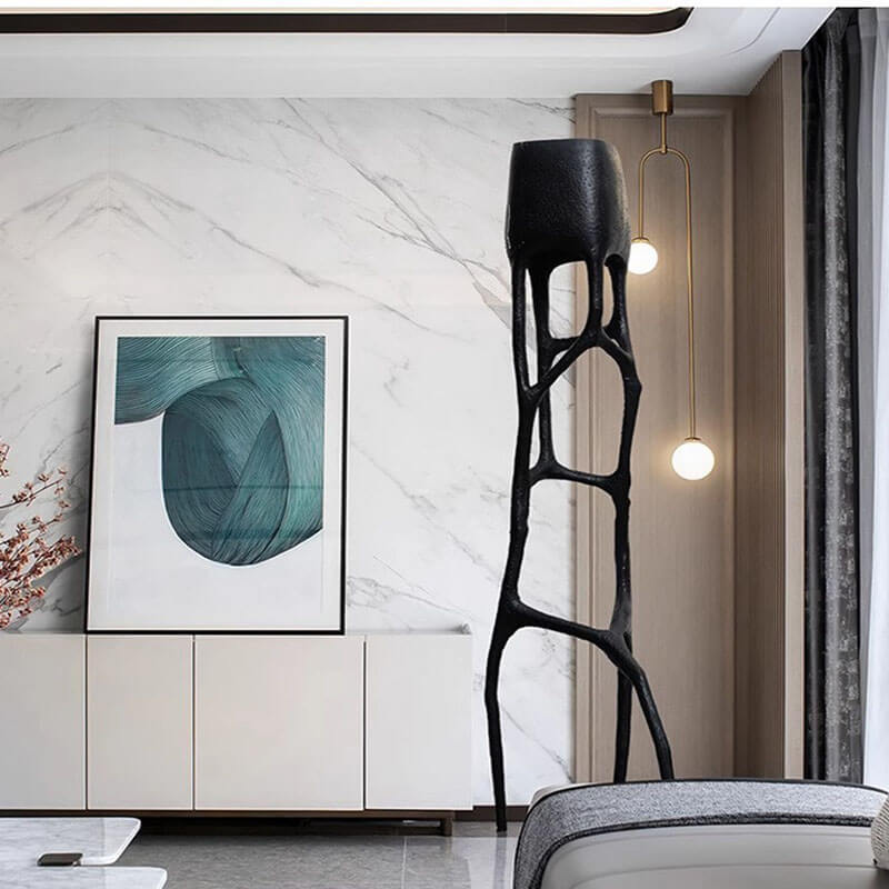 Această lampă de podea prezintă un design artistic și abstract, combinând texturi și culori contrastante. Partea superioară, unde se afla sursa de lumină, are o formă cilindrică și o culoare neagră mată, oferind un aspect solid și modern.