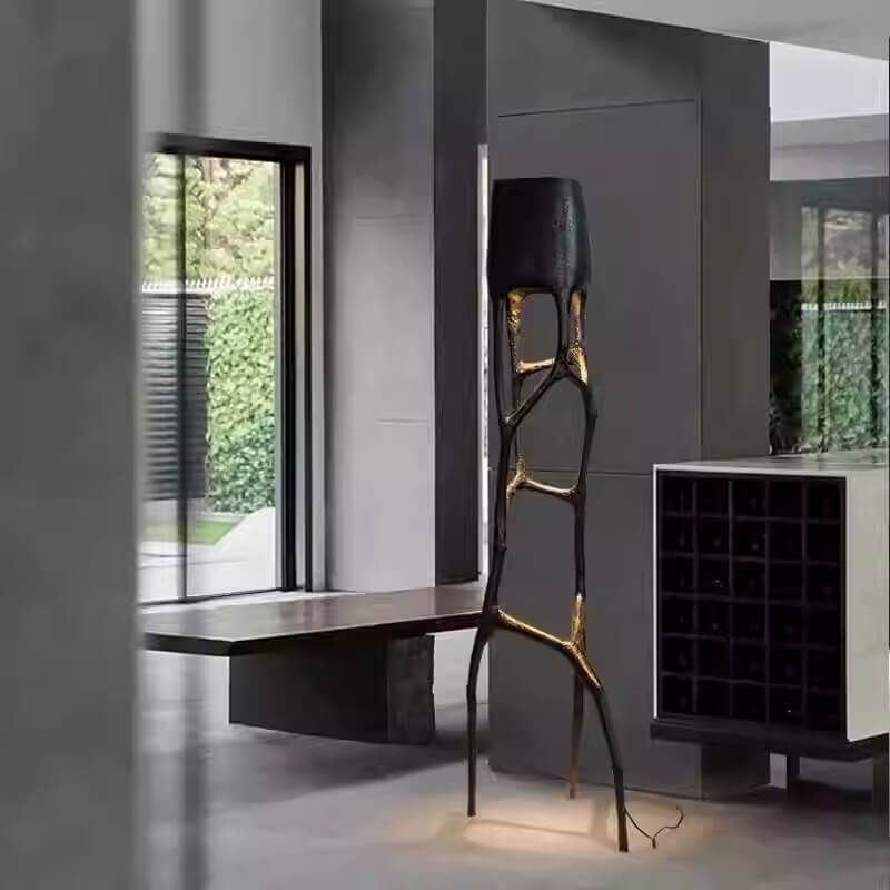 Corpul lămpii este structurat într-o manieră organică, amintind de ramuri sau de o structură celulară. Are un aspect scheletic, cu spații deschise care lasă lumina să se filtreze și să creeze efecte interesante de umbre. Materialul cu o finisare în două tonuri: un negru exterior și un auriu sau bronz interior, care adaugă o notă de eleganță și căldură vizuală.