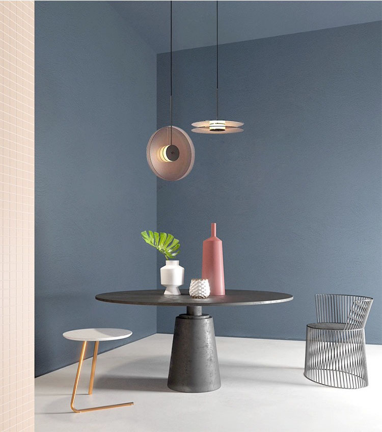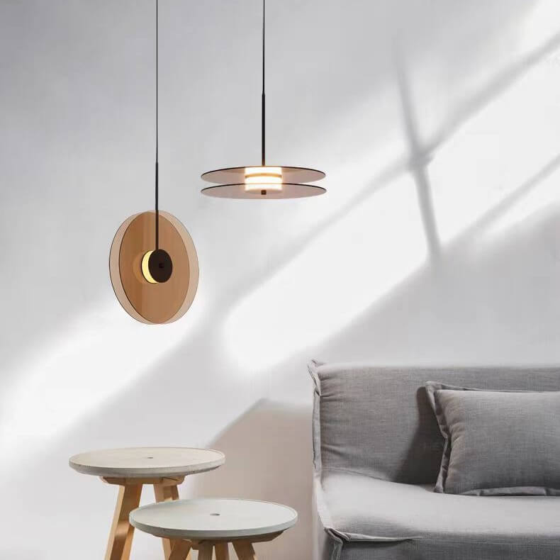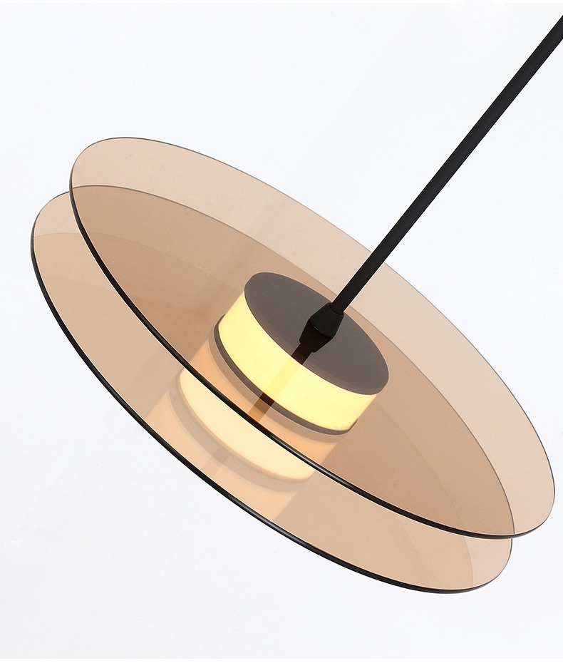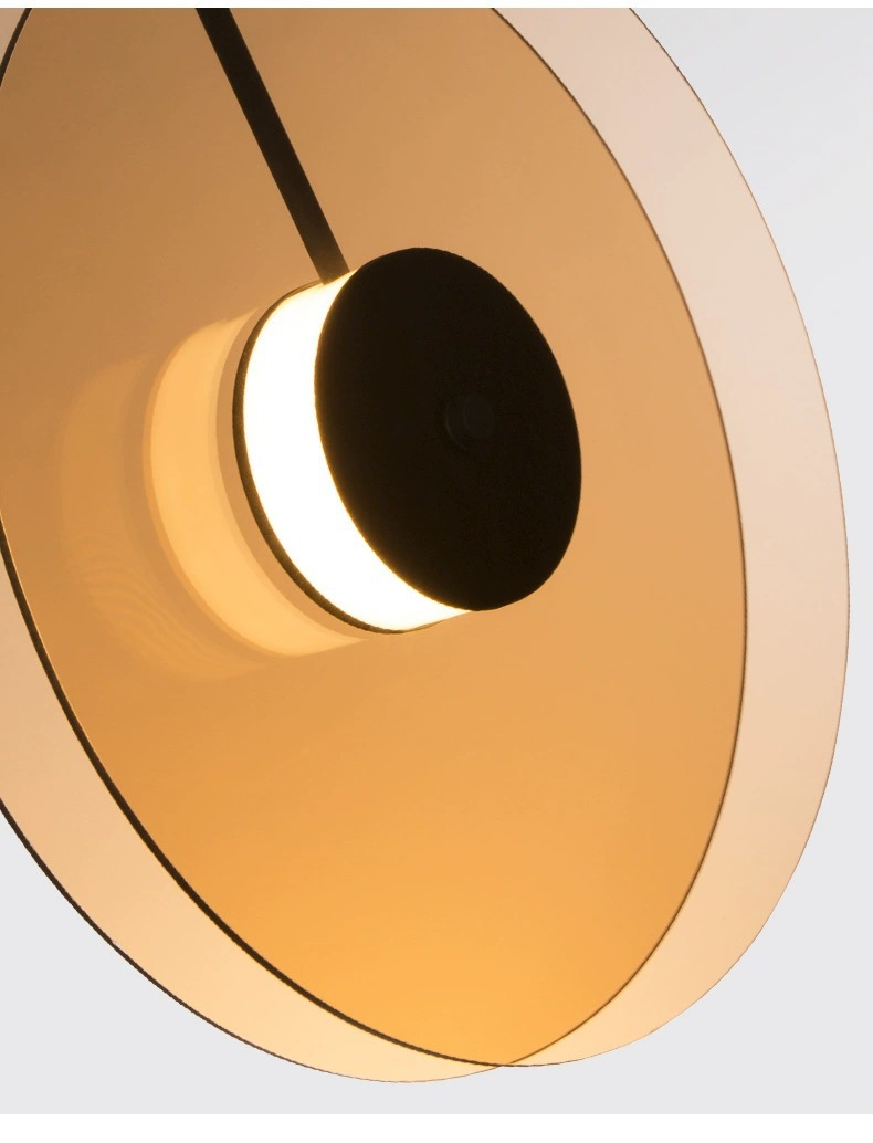 Fiecare corp de iluminat este compus din două discuri plate, de o nuanță caldă de maro fumuriu sau bronz translucid, care încadrează o sursă de lumină centrală.